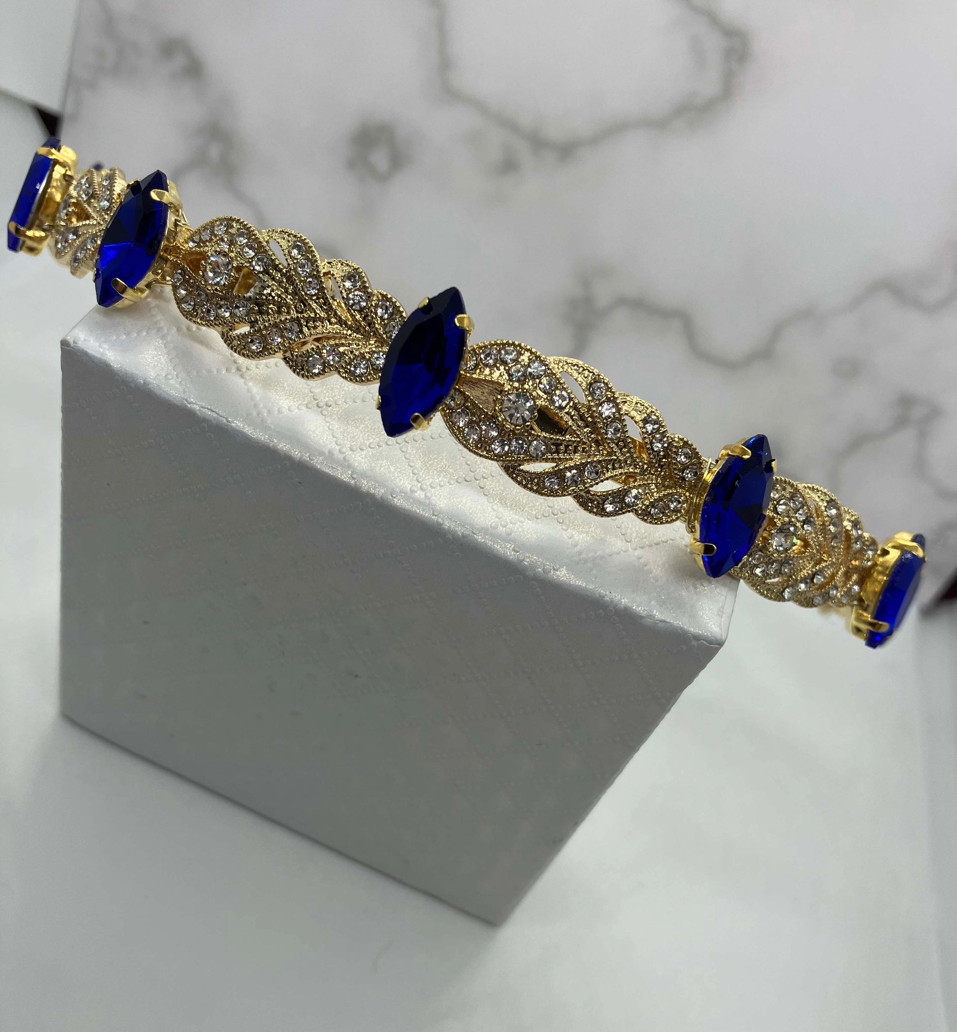 Sparkling gold crystal headband with Marquise cut Sapphire Blue Rhinestones