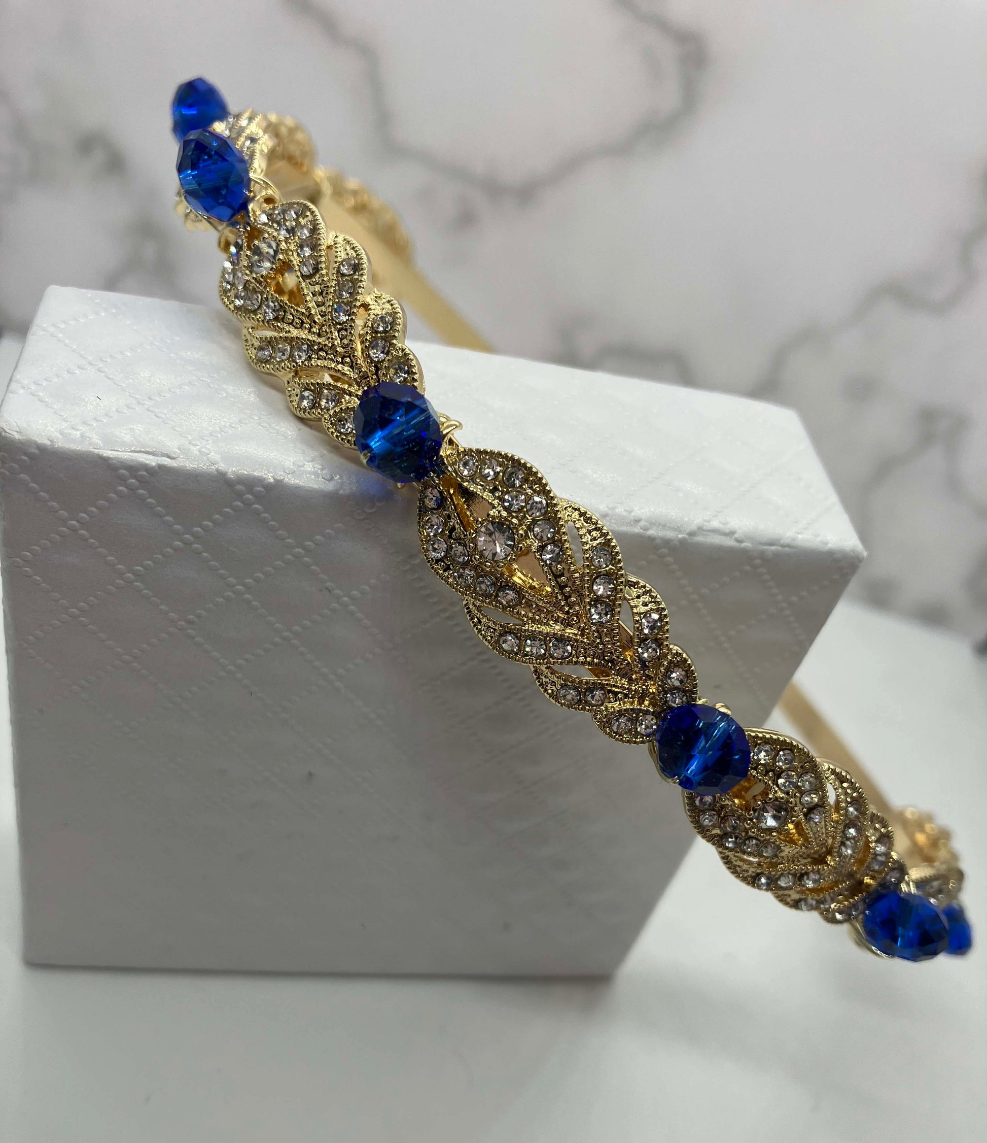Sparkling gold and crystal headband with Swarovski Sapphire Blue Crystals