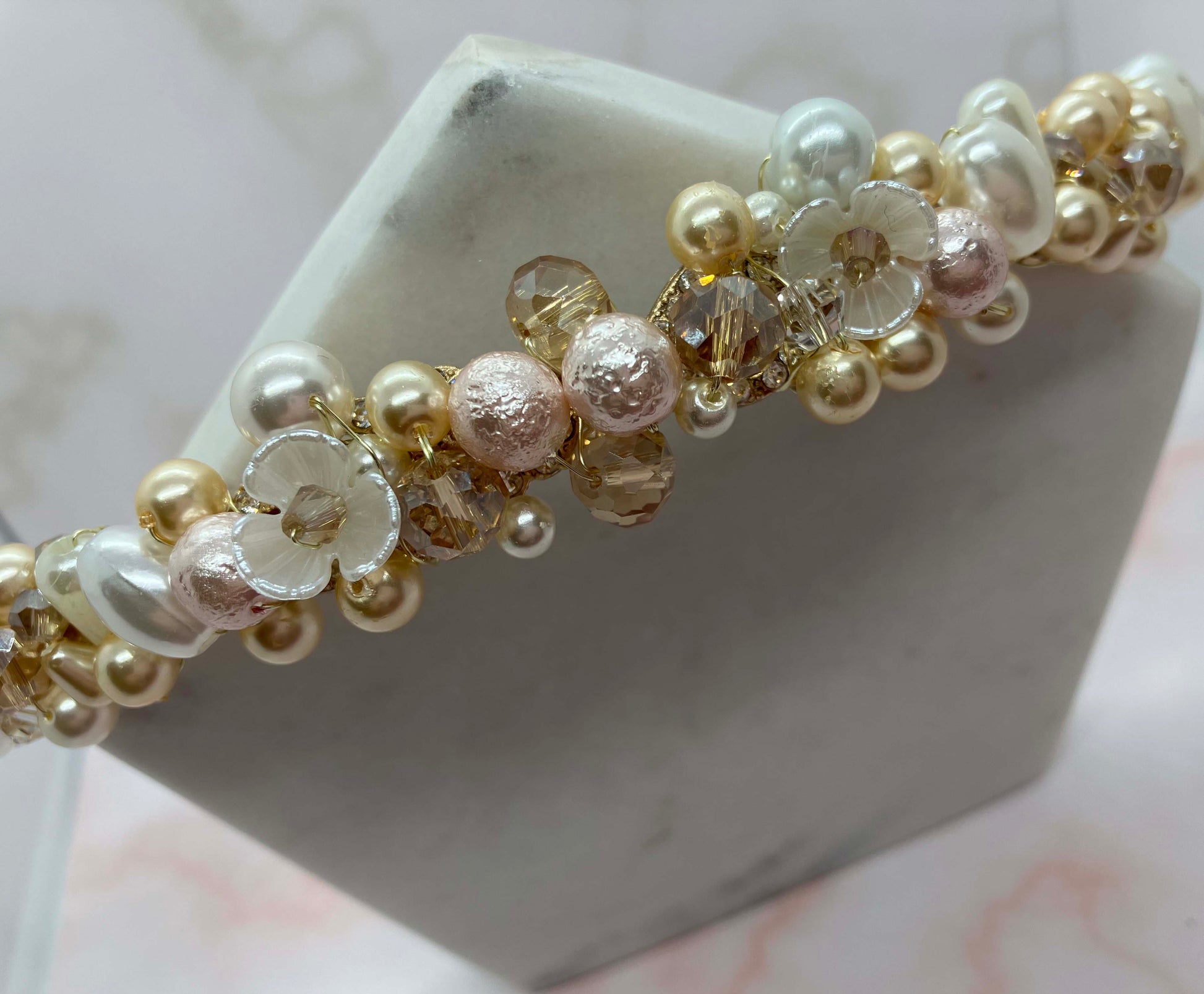 Gold Headband with Swarovski Pearls and Crystals in shades of Ivory, Gold and White.